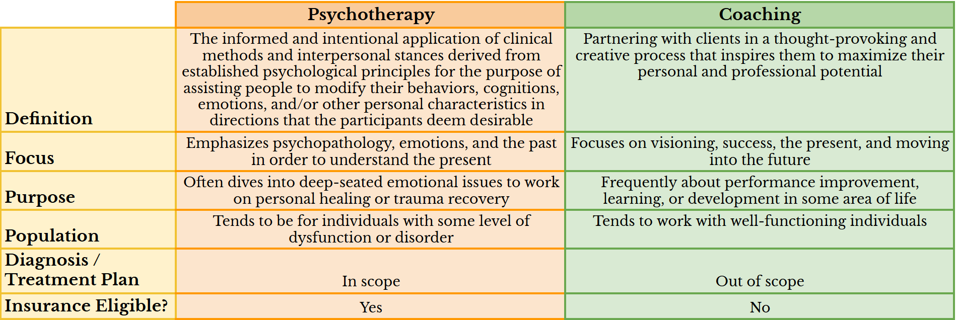 The differences between coaching and therapy can be somewhat blurry. This summary is taken from the ICF Guidelines, “When to refer a client to therapy”